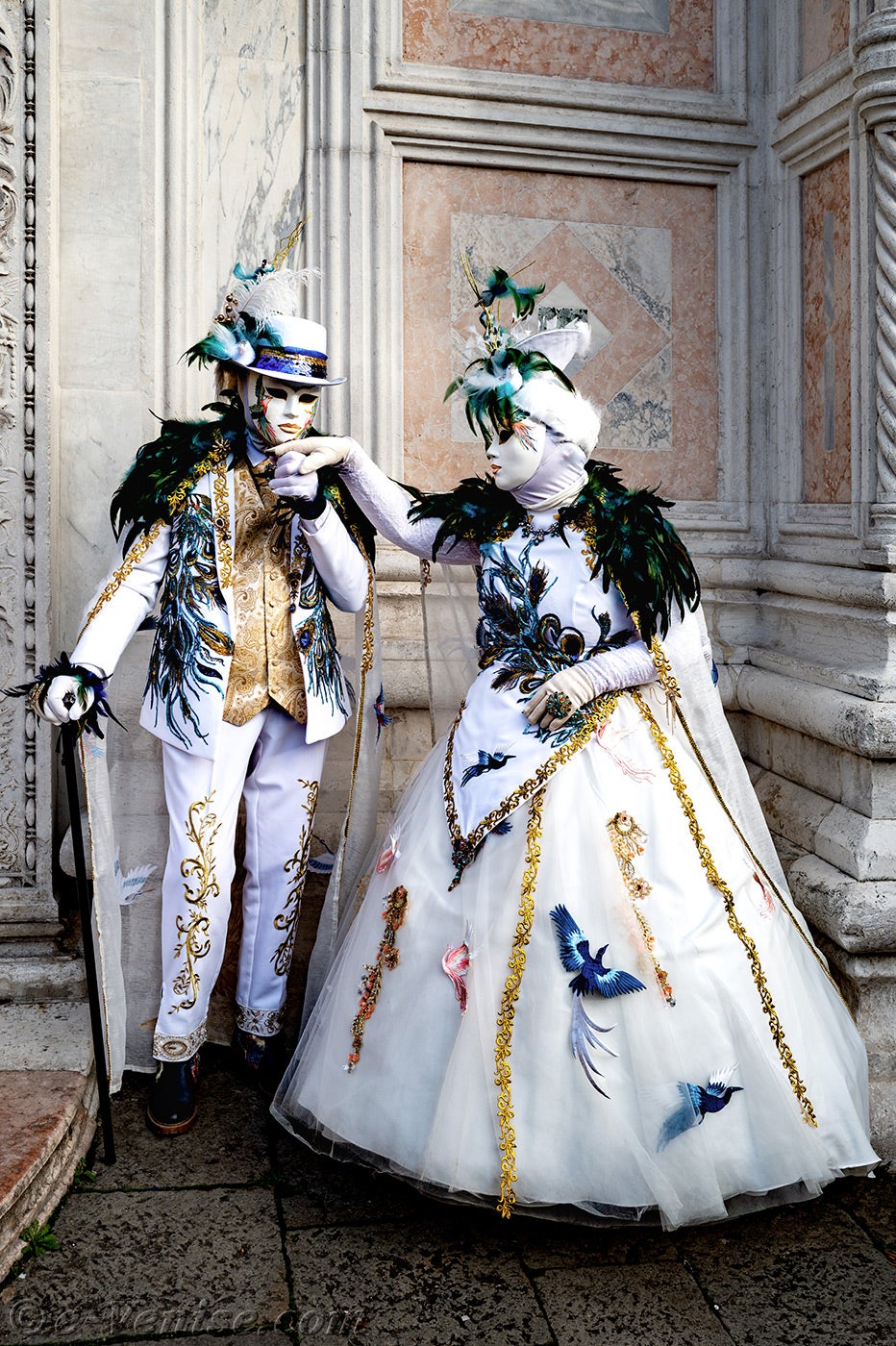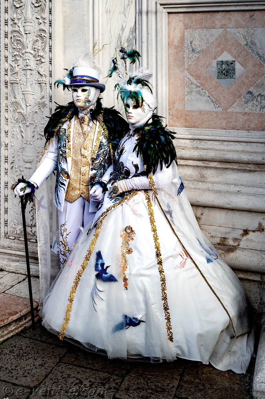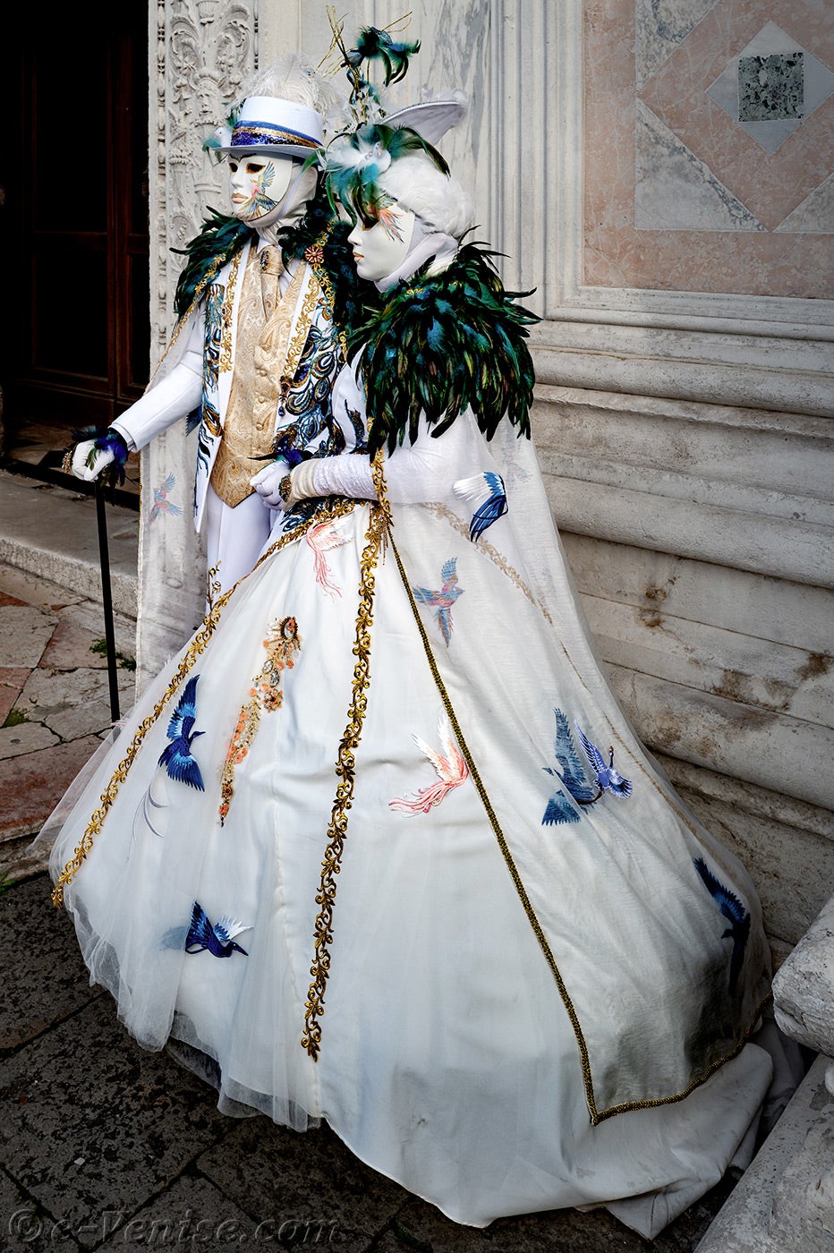 Devant l'église San Zaccaria, une belle dame, parée de plumes et de fleurs printanières, ouvrit la marche, suivie par un couple d'élégants oiseaux au plumage vert sombre.Ces derniers étaient suivis par les deux Pierrots et de deux dames élégantes et fleuries, vêtues de robes mauves et pourpres.