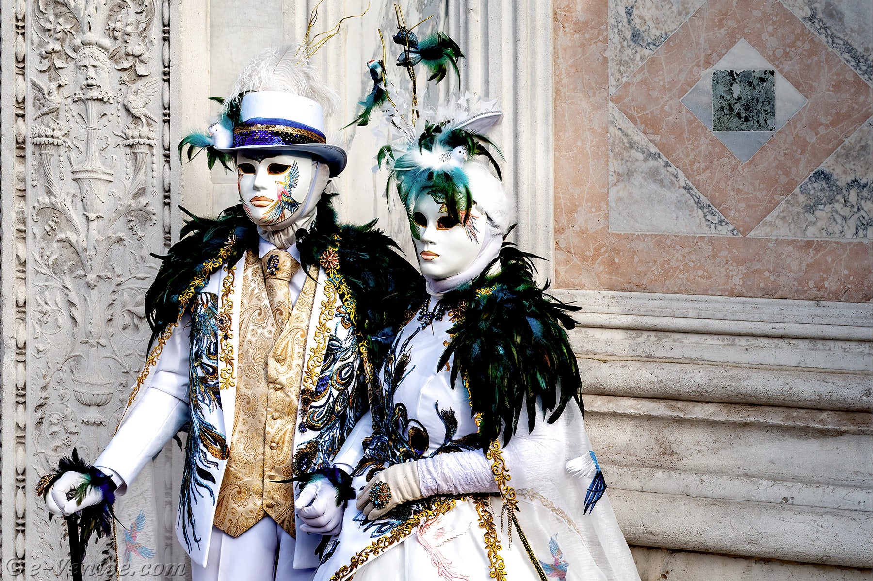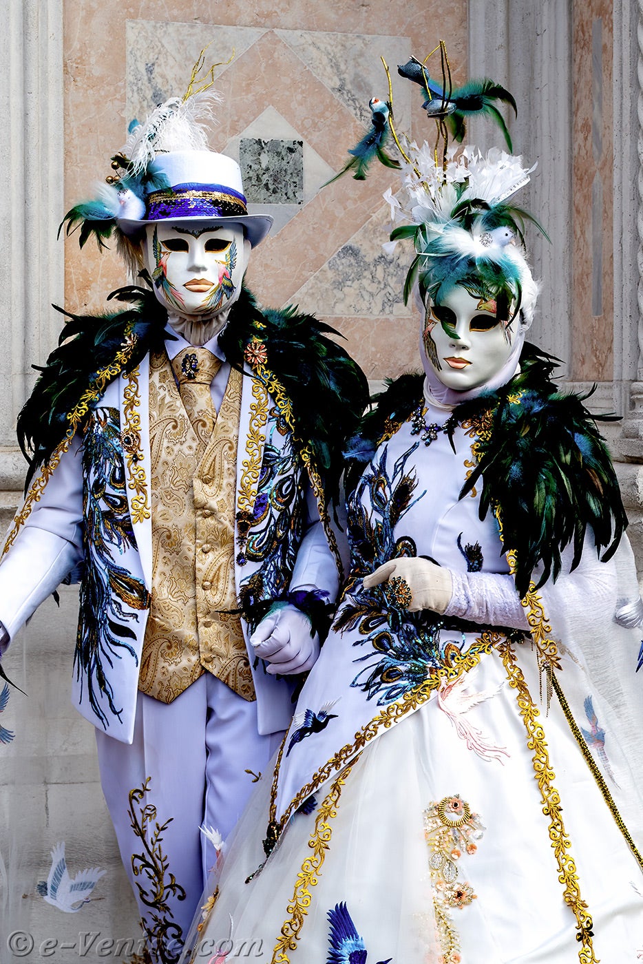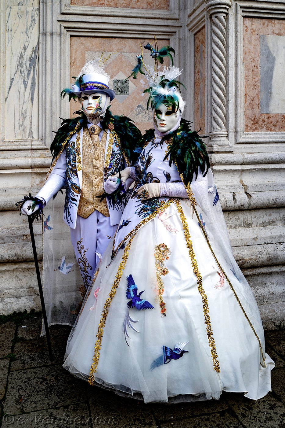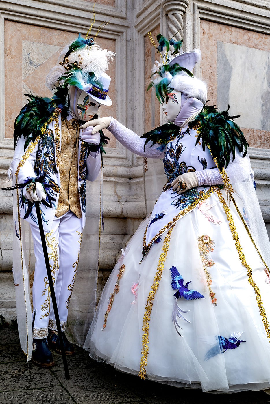 Devant l'église San Zaccaria, une belle dame, parée de plumes et de fleurs printanières, ouvrit la marche, suivie par un couple d'élégants oiseaux au plumage vert sombre.Ces derniers étaient suivis par les deux Pierrots et de deux dames élégantes et fleuries, vêtues de robes mauves et pourpres.