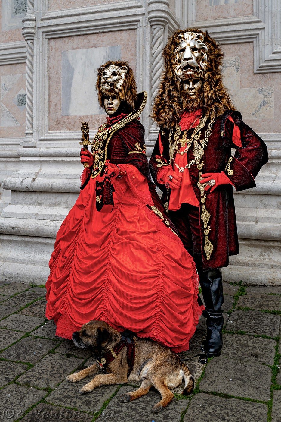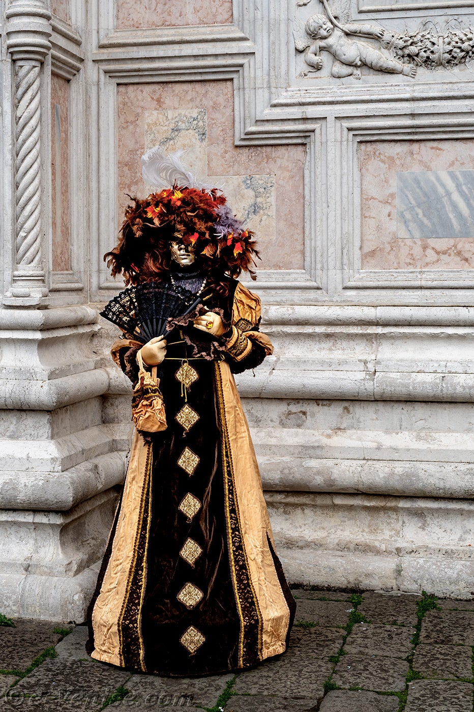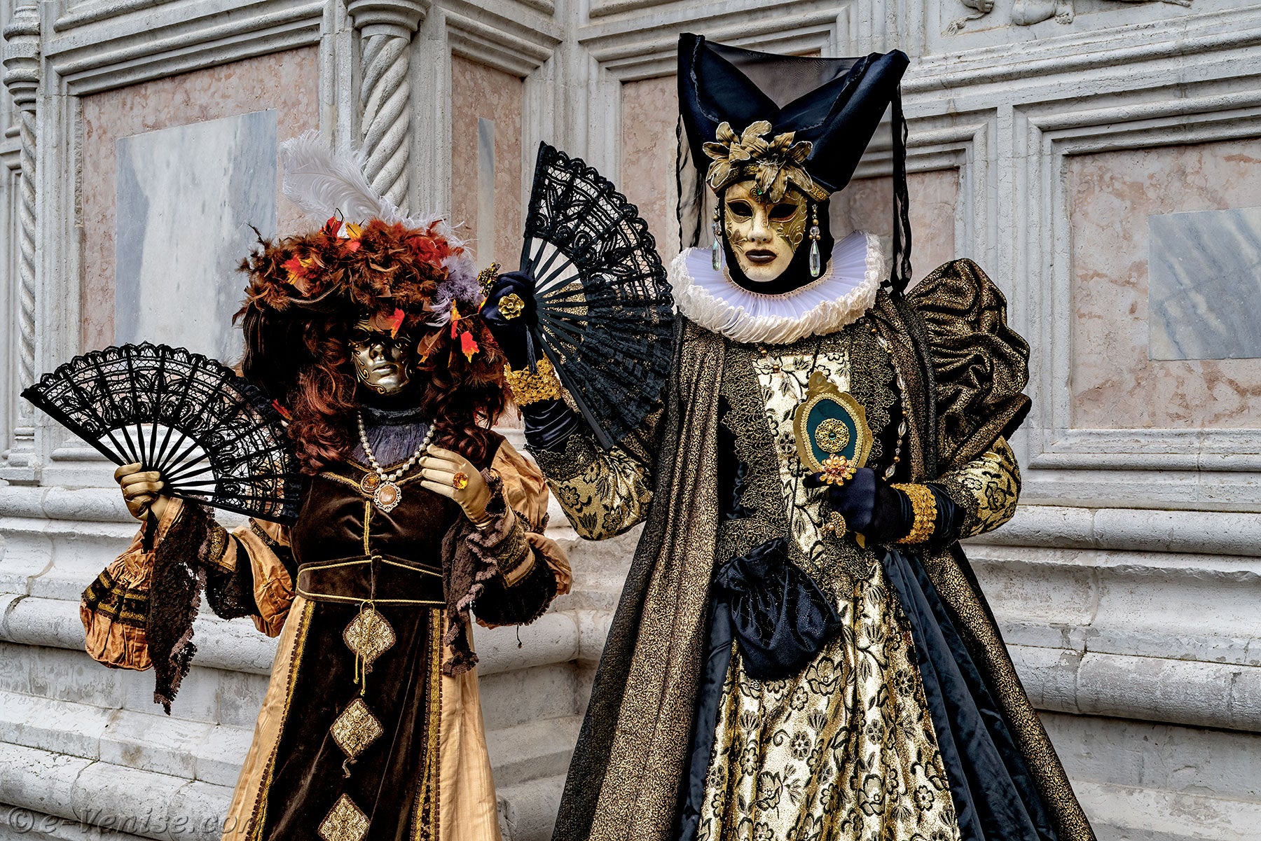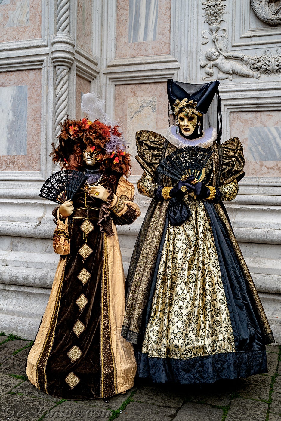 Après que ces lions peu rassurants se fussent éloignés, une noble dame, vêtue en noir et or, avec sa suivante, à la coiffe ornée de fleurs, ont pris place devant l'église San Zaccaria.
