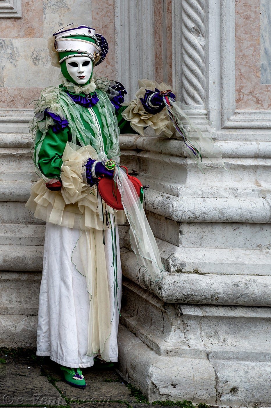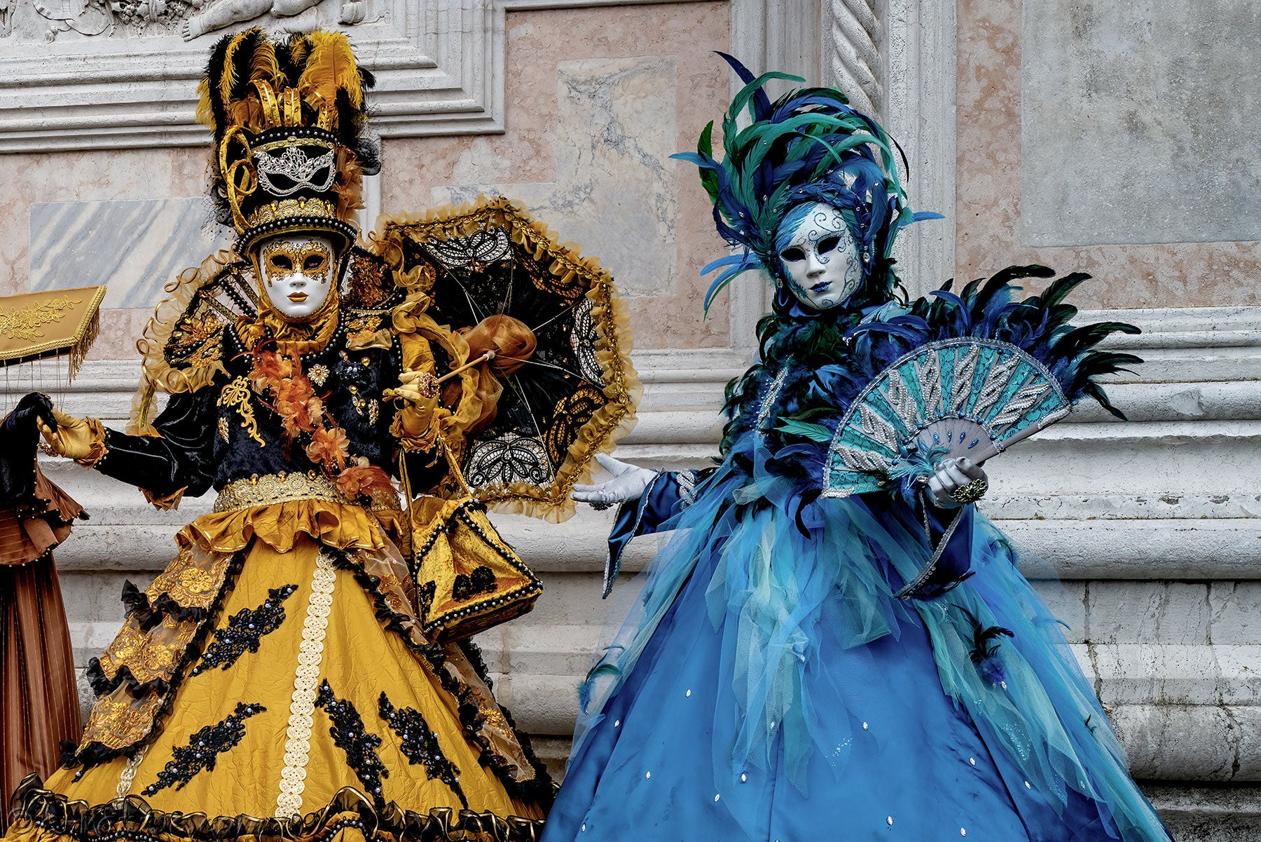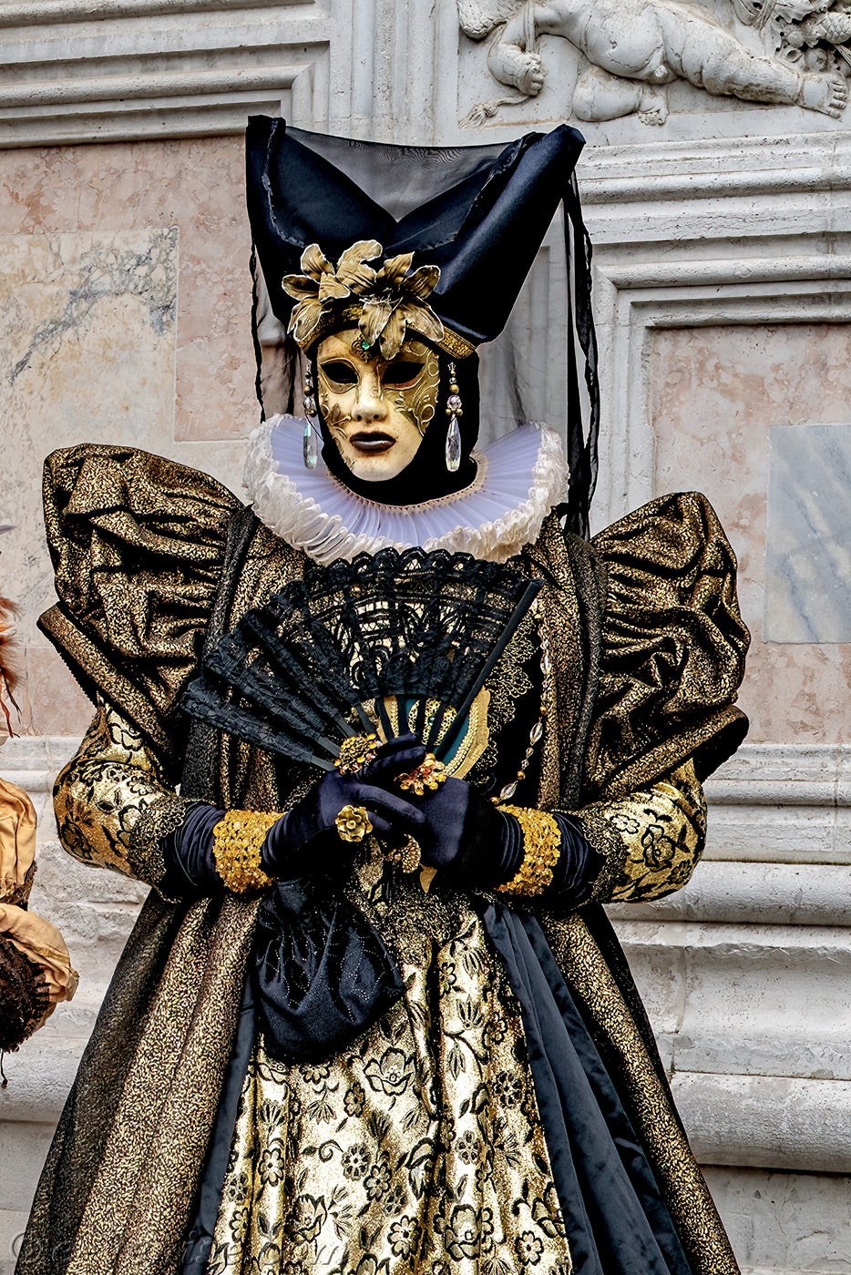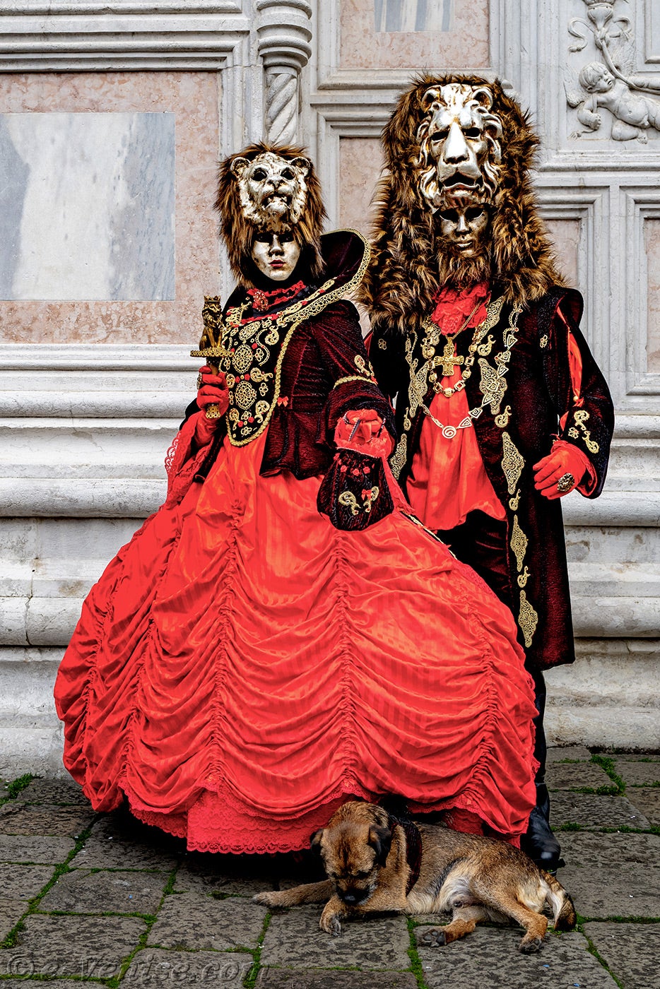 Après que ces lions peu rassurants se fussent éloignés, une noble dame, vêtue en noir et or, avec sa suivante, à la coiffe ornée de fleurs, ont pris place devant l'église San Zaccaria.