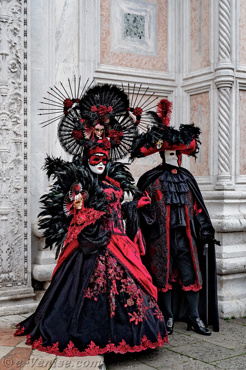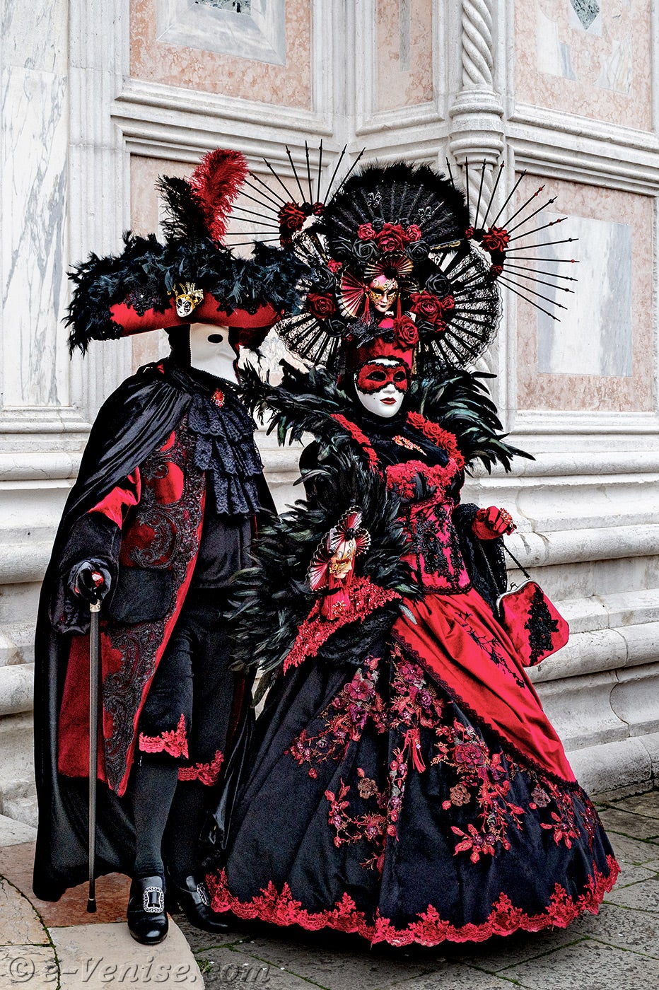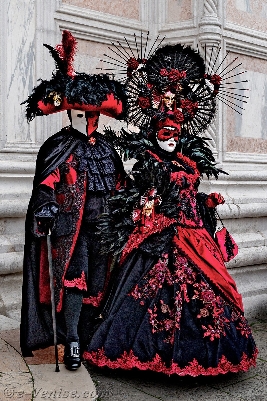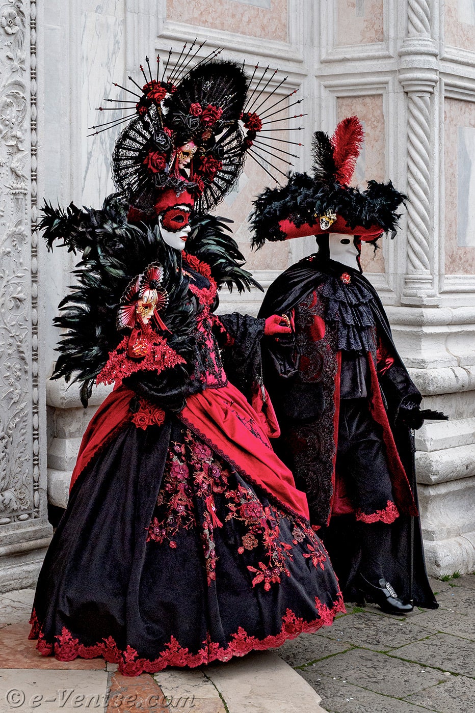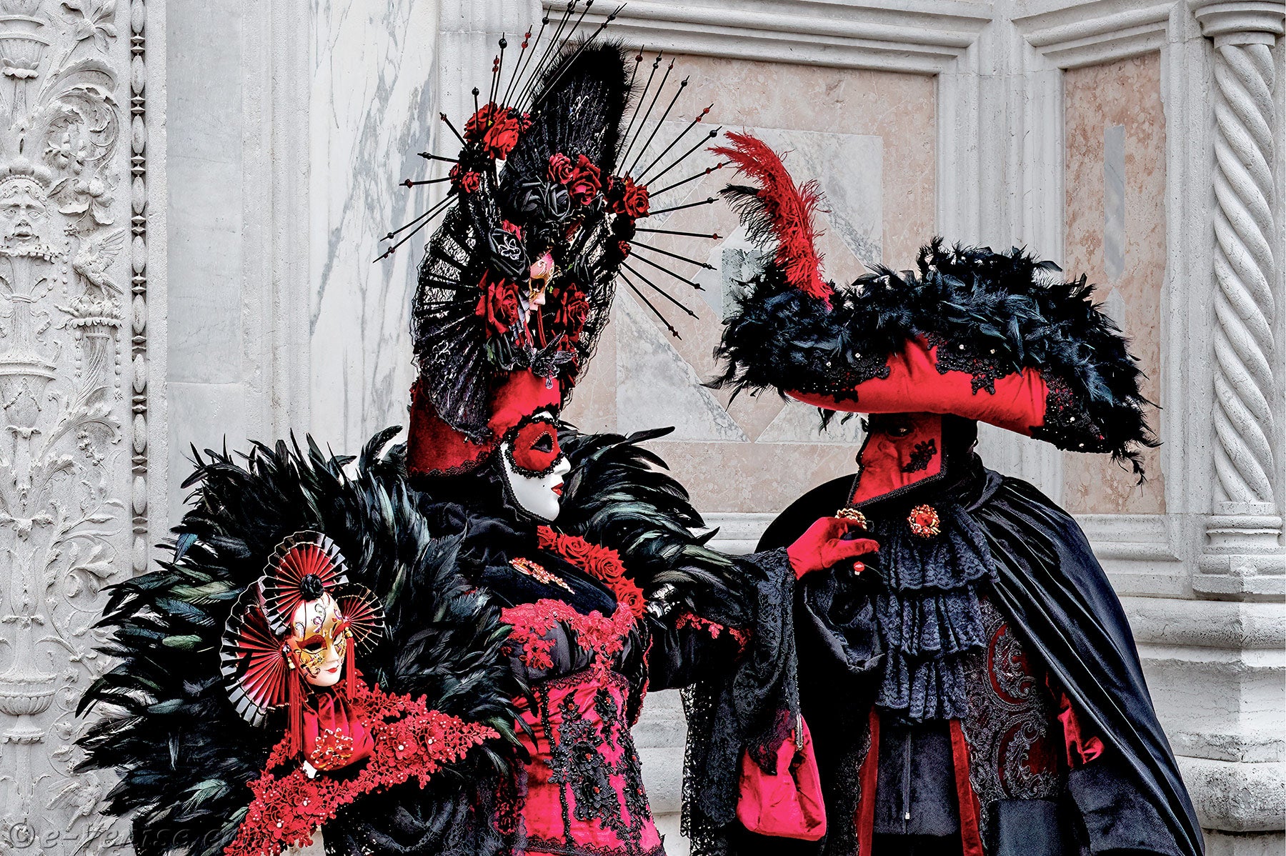Un magnifique couple, habillé en rouge et noir, avec de longues plumes irisées de vert profond, s'avançait.La dame vêtue d'une robe ornée de fleurs, tendait la main à son chevalier servant pour qu'il y dépose un baiser.