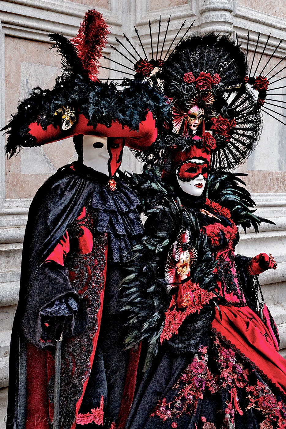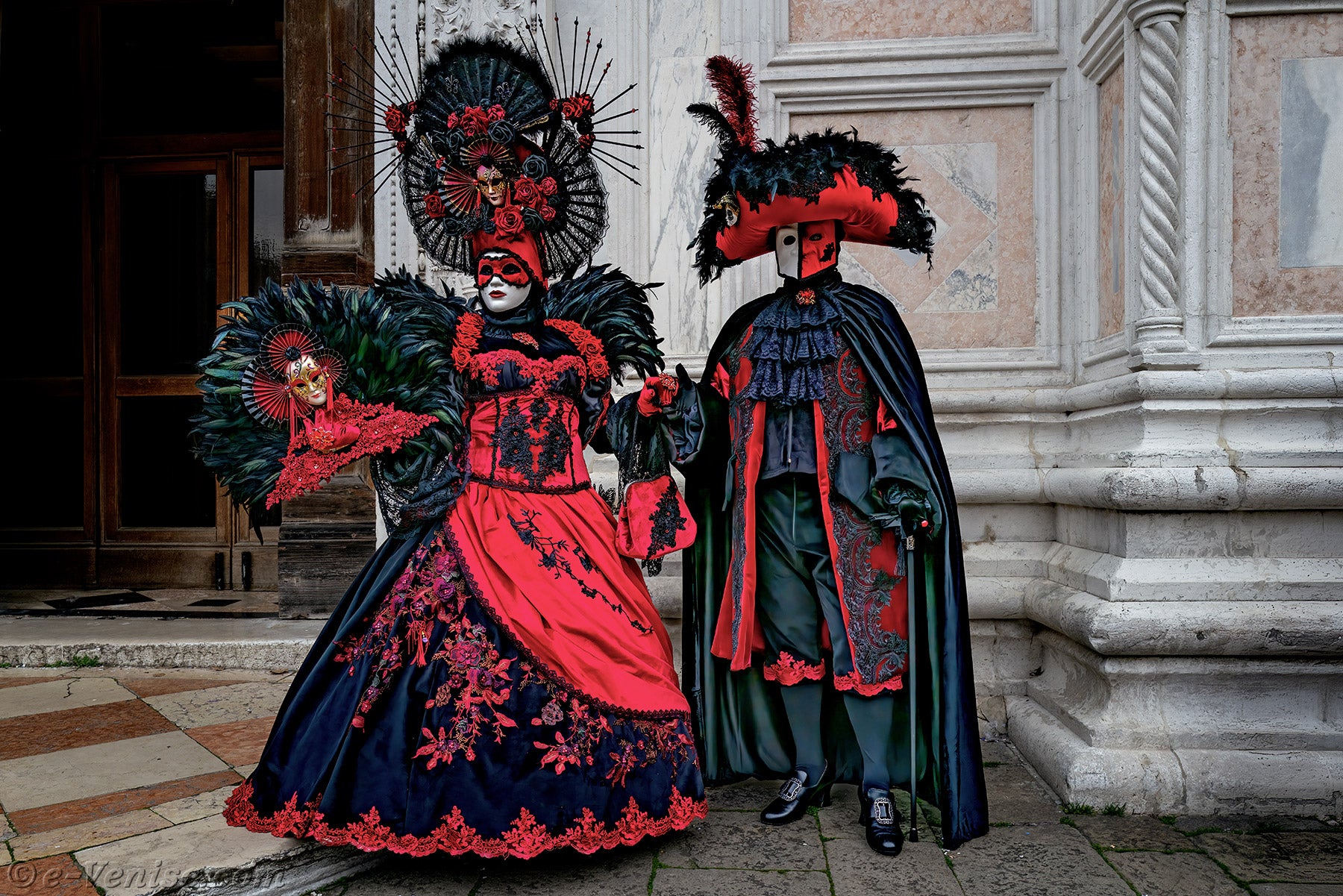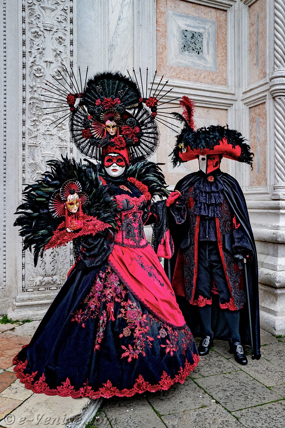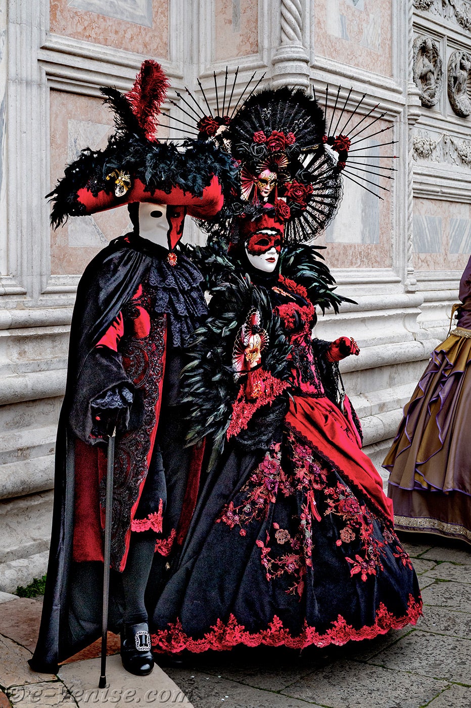 Un magnifique couple, habillé en rouge et noir, avec de longues plumes irisées de vert profond, s'avançait.La dame vêtue d'une robe ornée de fleurs, tendait la main à son chevalier servant pour qu'il y dépose un baiser.