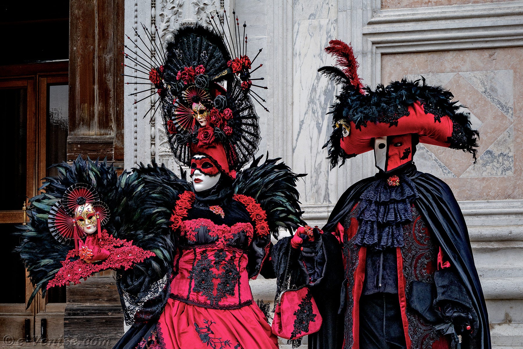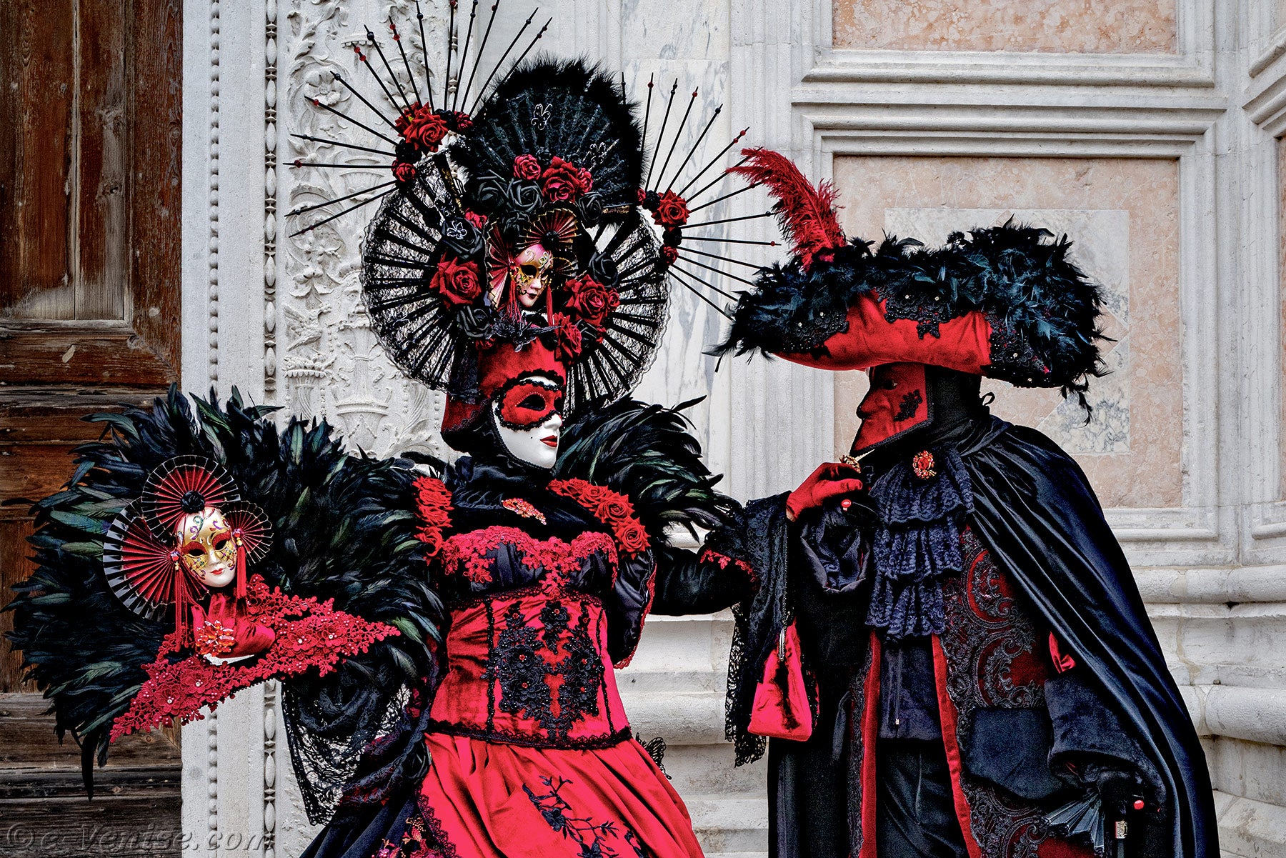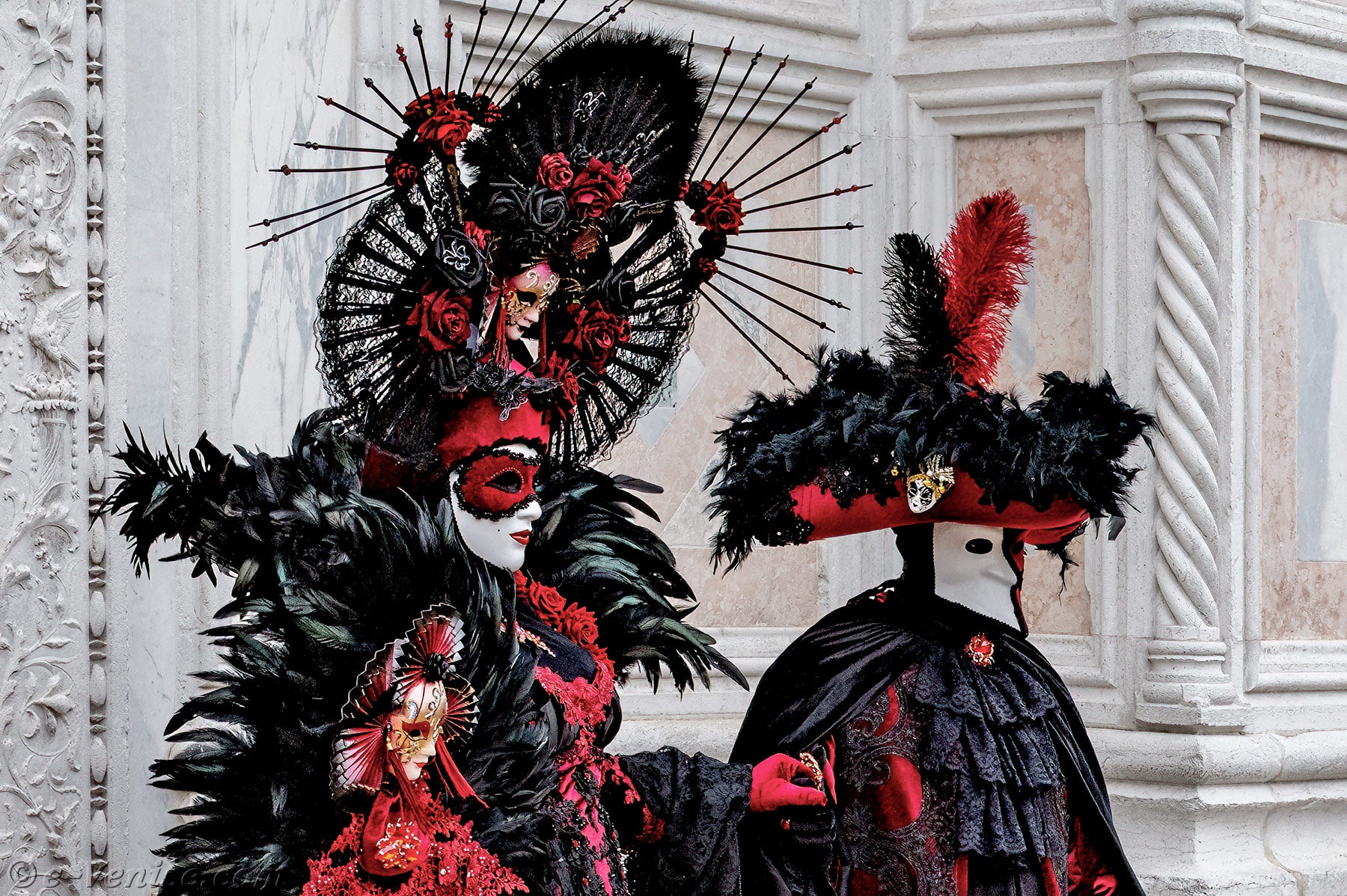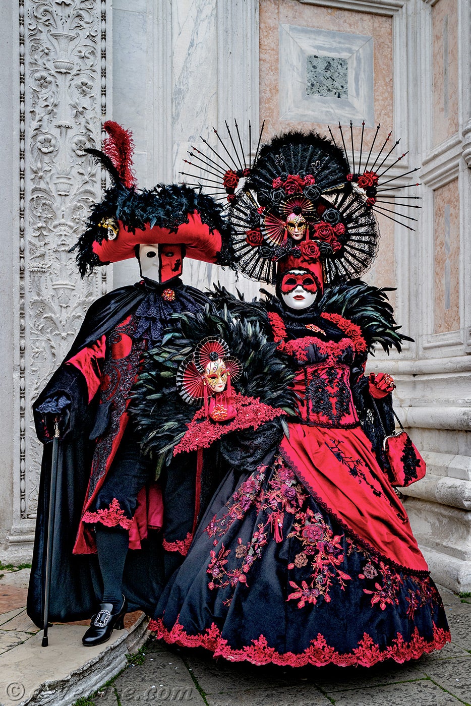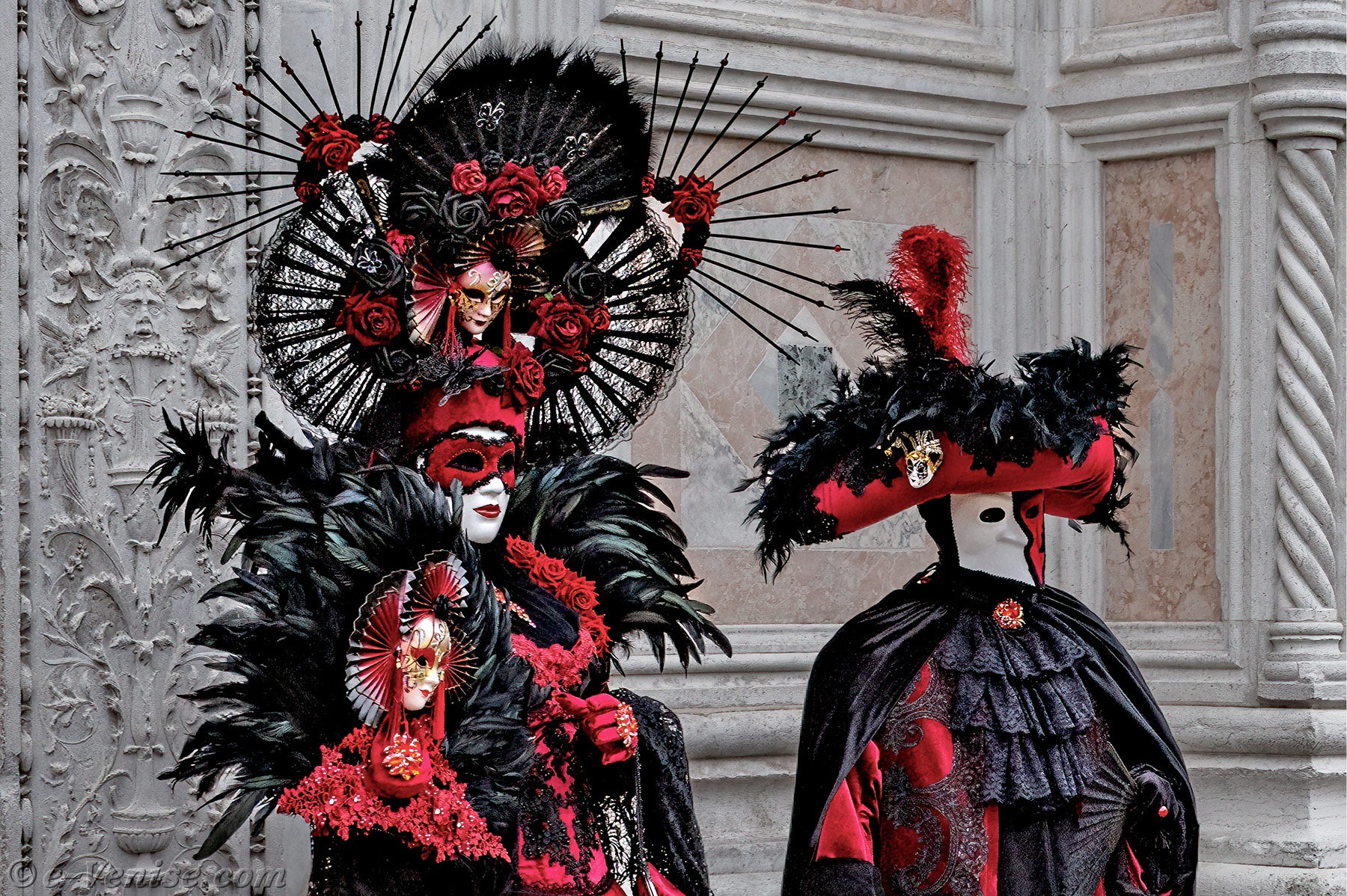 Un magnifique couple, habillé en rouge et noir, avec de longues plumes irisées de vert profond, s'avançait.La dame vêtue d'une robe ornée de fleurs, tendait la main à son chevalier servant pour qu'il y dépose un baiser.