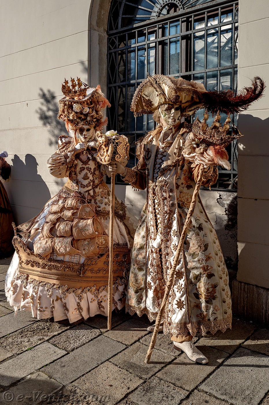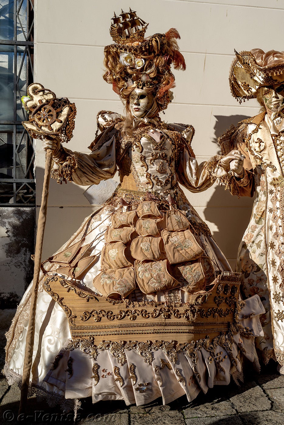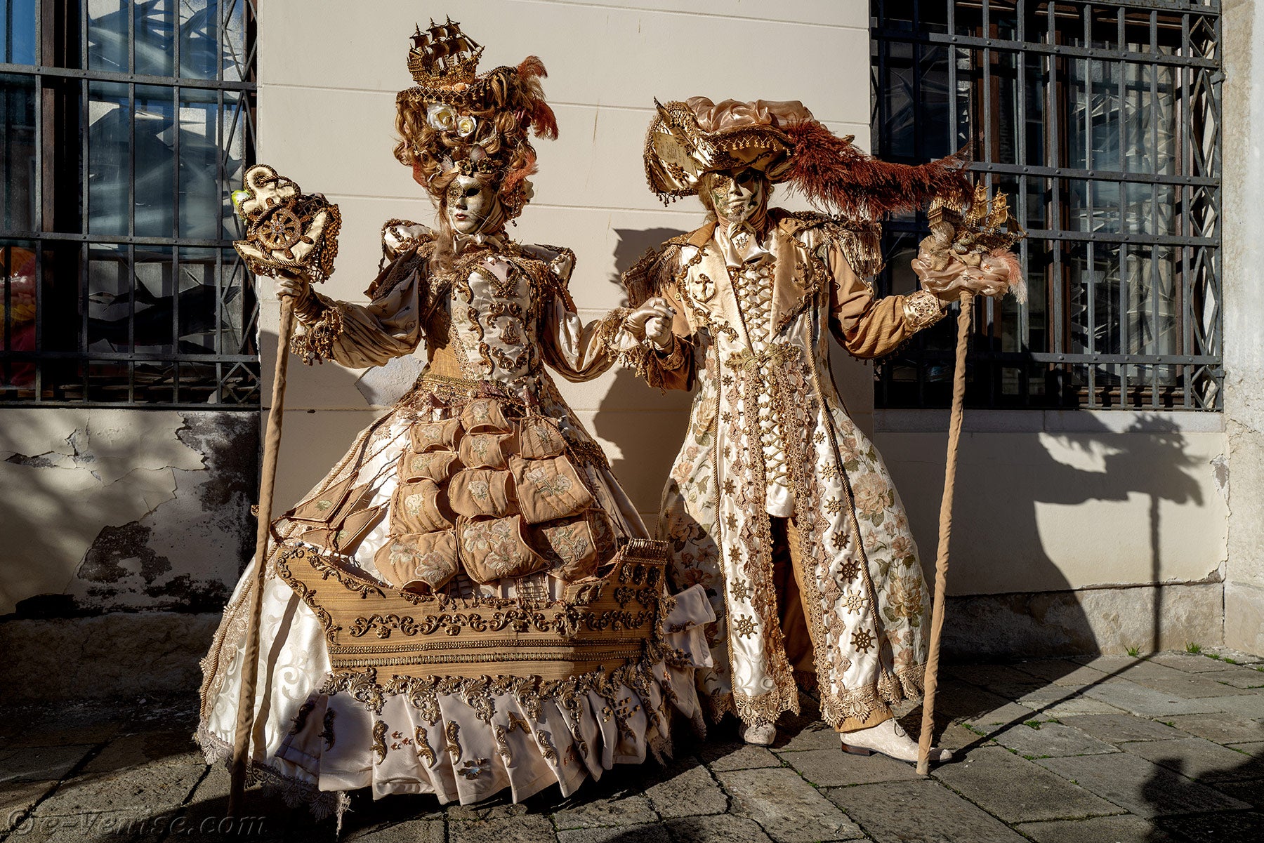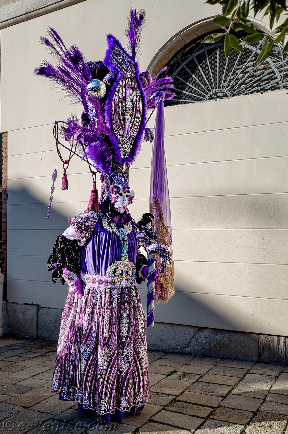 Avec une coiffe presque aussi haute que son corps, brodée avec des fleurs, des bijoux et des plumes de couleur mauve, ce personnage imposant, armé d'un bâton décoré d'un fou royal, a fait le bonheur des spectateurs du Carnaval de Venise 2026 sur le Campo San Lorenzo.Un couple de pirates vêtu de costumes beige et marron, tout simplement superbes, nous a tout autant enthousiasmés.