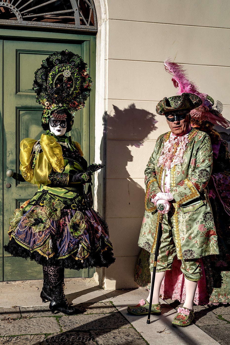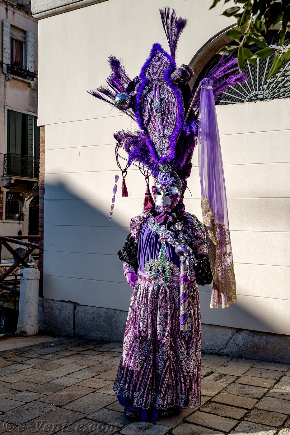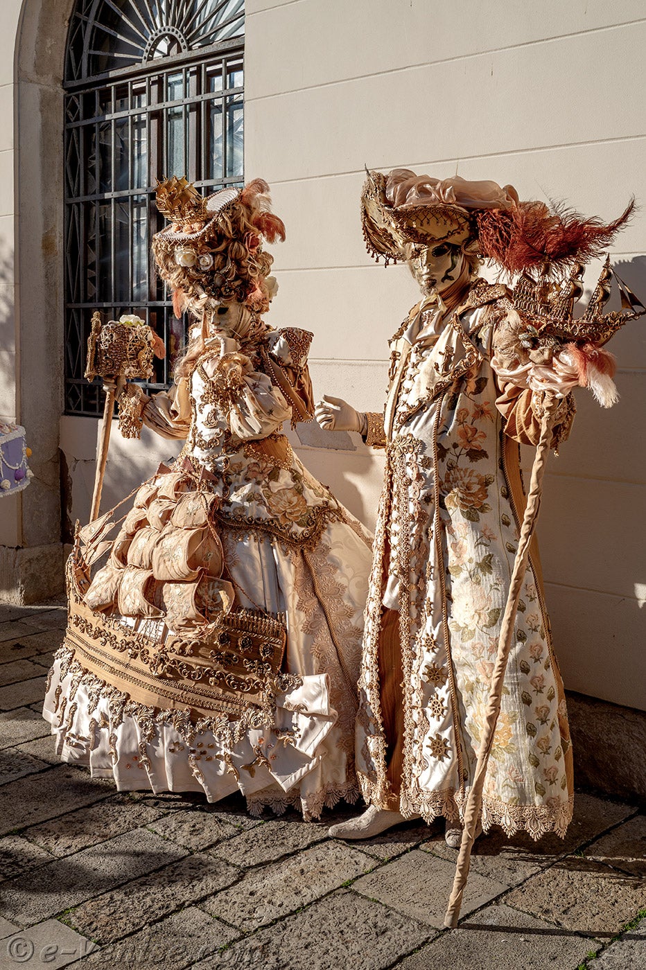 Avec une coiffe presque aussi haute que son corps, brodée avec des fleurs, des bijoux et des plumes de couleur mauve, ce personnage imposant, armé d'un bâton décoré d'un fou royal, a fait le bonheur des spectateurs du Carnaval de Venise 2026 sur le Campo San Lorenzo.Un couple de pirates vêtu de costumes beige et marron, tout simplement superbes, nous a tout autant enthousiasmés.