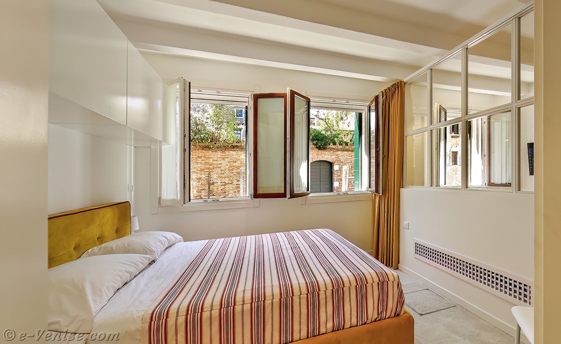 Une jolie et grande chambre ouvre directement à votre gauche lorsque vous entrez dans l’appartement.Cette chambre est baignée de lumière grâce à ses deux grandes fenêtres offrant une jolie vue sur la Fondamenta et le Rio Trapolin, ainsi que sur les lauriers roses du jardin qui se dressent face à vous.