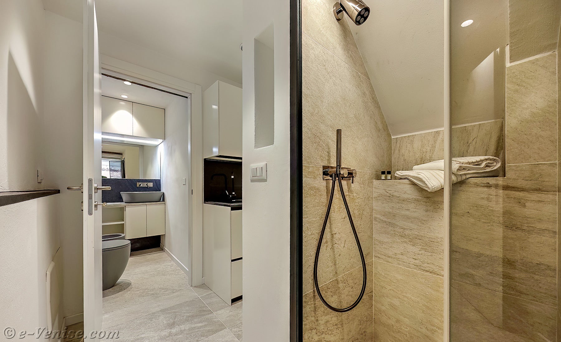 La douche, séparée de la salle de bains, est située dans le couloir menant de la salle à manger à la cuisine.
